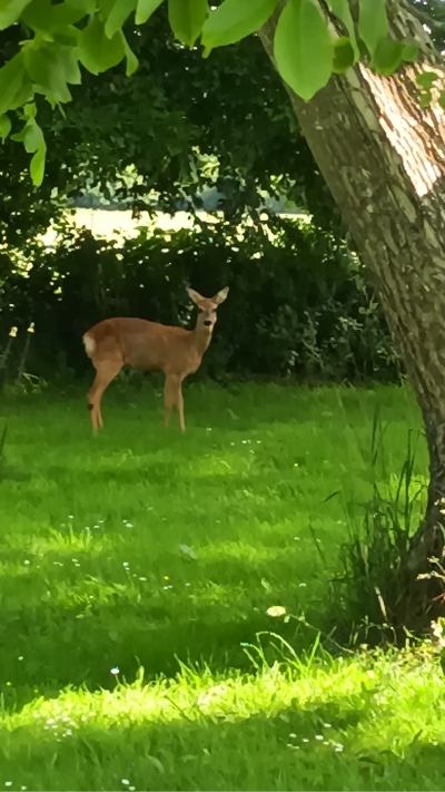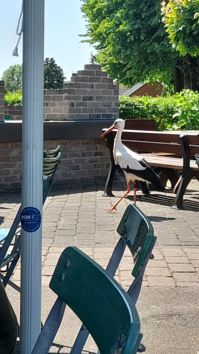 Besondere tierische Begegnungen: Ein Reh, welches irgendwo auf dem Grundstück oder in grundstücksnähe sein Kitz abgelegt hatte und ein Storch, der auf der Terasse eines Lokals neben den Gästen herum spazierte.